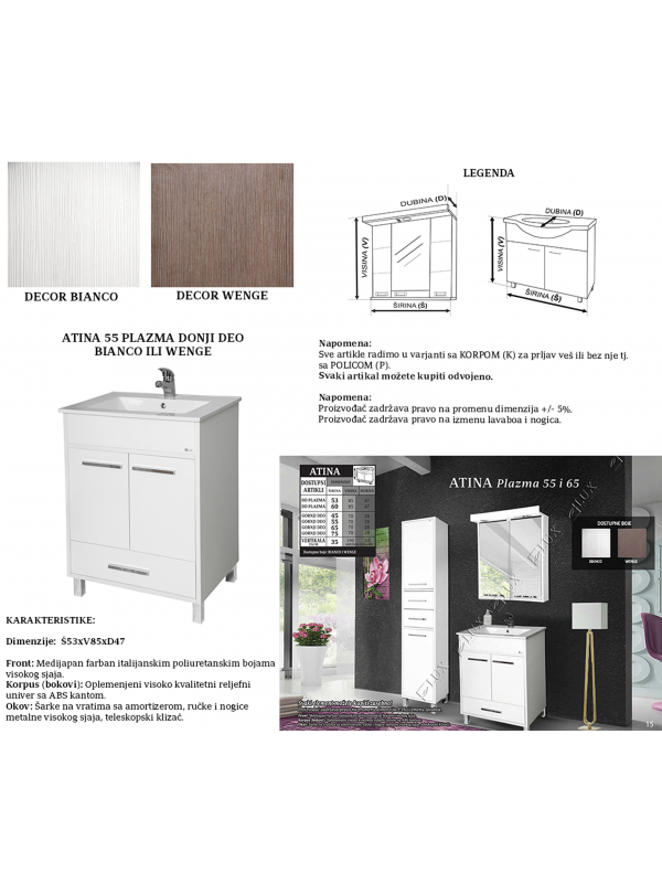 Kupatilski ormarić donji Lux Atina Plazma 55 je toaletni ormarić dimenzija 53x85x47cm. Kvalitetne je izrade, od medijapana i oplemenjenog reljefnog univera. Kupatilski ormarić donji Lux Atina Plazma 55 čini veći odeljak za držanje kućne hemije, rezervnih peškira i sličnog, fioka u dužini ormarića i lavabo bez baterije. Ručke su pravougaonog oblika i napravljene od metala visokog sjaja, kao i nogari. Kupatilski ormarić donji Lux Atina Plazma 55 se može naručiti u beloj boji ili u braon boji sa belim vratima.