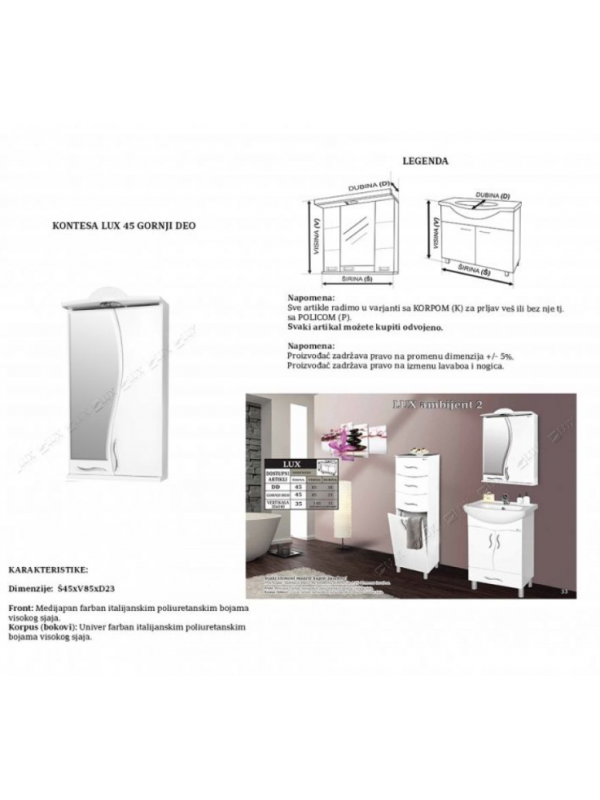 Ogledalo sa ormarićem Kontesa Lux 45x85x23 izrađen je po savremenim standardima u opremanju kupatila. Izrađuje se od najsavremenijih pločastih materijala. Kupatilski nameštaj Lux je izrađen od medijapana visokog kvaliteta. Kupatilski nameštaj Lux se tretira poliuretanskim podlogama visokog sjaja. Ova boja je vodootporna tako da je upravo i namenjena za korišćenje u kupatilu. Održavanje kupatilskog nameštaja Lux je veoma jednostavno. Najbolje je korišćenje tečnih sredstava, a potrebno je izbegavati upotrebu abrazivnih sredstava i kiselina jer se vremenom proizvod može oštetiti.