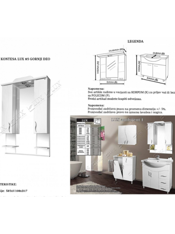 SRBIJA Kontesa 85 GORNJI DEO Kupatilski nameštaj Kontesa Lux izrađen je posavremenim standardima u opremanju kupatila. Izrađuje s.. Product #: LUX136 Regular price: 16,830.00 RSD 16,830.00 RSD Na stanju