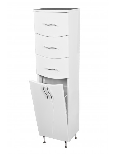 Kupatilski ormarić vertikala Lux 35x140 polica je funkcionalan orman, koji se sastoji od korpe za prljav veš, skrivene vratima elementa, od nekoliko fioka i jedne police za odlaganje rezervnih peškira ili drugih predmeta. Kupatilski ormarić vertikala Lux 35x140 polica je jednostavnog, ali elegantnog dizajna, sa stilizovanim ručicama i zaobljenim nogarima napravljenim od metala visokog sjaja. Kupatilski ormarić vertikala Lux 35x140 polica je napravljen sa frontom od medijapana i korpusom od univera, zaštićenim specijalnom poliuretanskom bojom