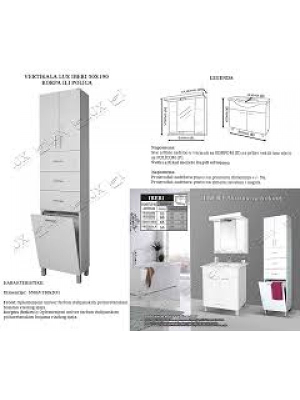 Kupatilski ormarić vertikala Lux Iberi 50x190 je pravo rešenje za problem odlaganja predmeta u kupatilu. Zbog svojih praktičnih dimenzija, zauzima malo prostora u kupatilu. Enterijer kupatilskog ormarića vertikala Lux Iberi 50x190 se sastoji iz tri fioke i dve police. Kupatilski ormarić vertikala Lux Iberi 50x190 je izrađen od kvalitetnih materijala, medijapana na frontu i oplemenjenog univera na bokovima, presvučenim belom italijanskom poliuretanskom bojom. Nogari i ručke ormarića izrađeni su od metala visokog sjaja.