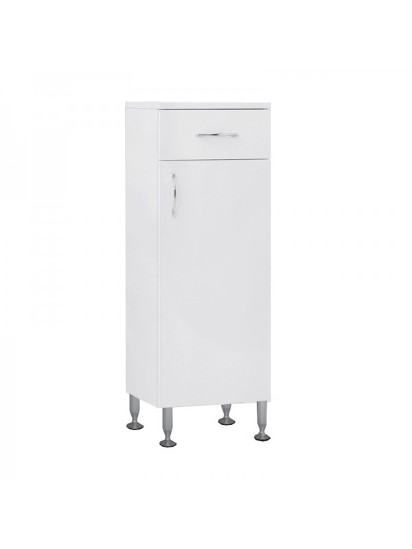 Stojeći kupatilski ormarić sa praktičnom fiokom, izrađen od medijapana u beloj boji, zahvalnoj za uklapanje sa ostatkom sanitarije.
