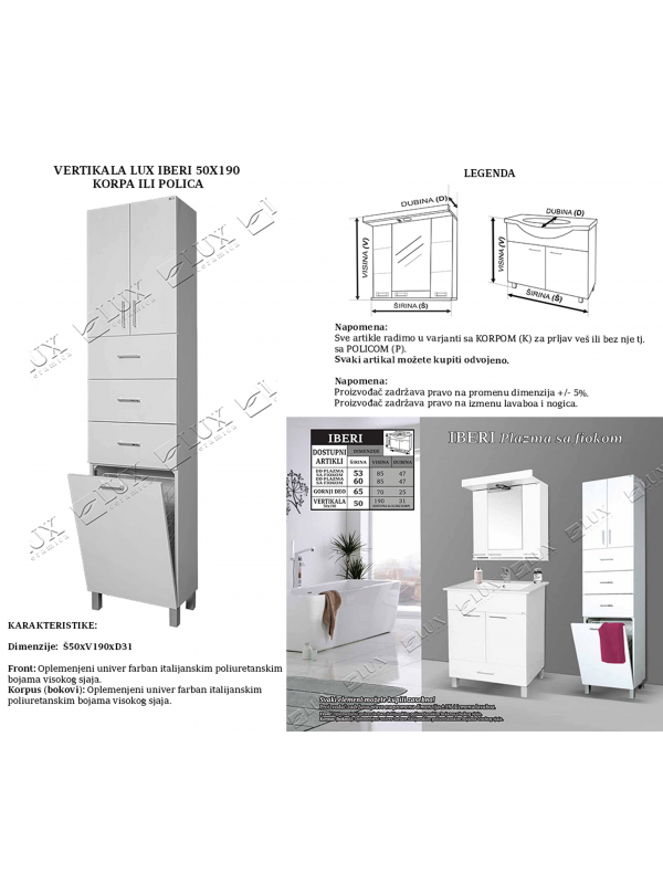 Kupatilski ormarić vertikala Lux Iberi 50x190 korpa je visoki orman dimenzija 50x190x31cm, za dovoljno prostora za odlaganje svih neophodnih komada pribora, uređaja i sredstava higijene u kupatilu. Kupatilski ormarić vertikala Lux Iberi 50x190 korpa je napravljen od medijapana i oplemenjenog univera, farbanog italijanskim poliuretanskim bojama, sa metalnim ručkama i nogarima. Visoki nogari čuvaju orman od vlage sa poda i istovremeno olakšavaju čišćenje prostora. Kupatilski ormarić vertikala Lux Iberi 50x190 korpa čine, komforna korpa za prljav veš, skrivena u pregradi ormana, tri fioke i veća polica za odlaganje.