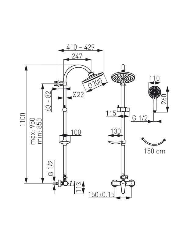 - G1/2 ekscentri 150 +/- 20 mm podesivi